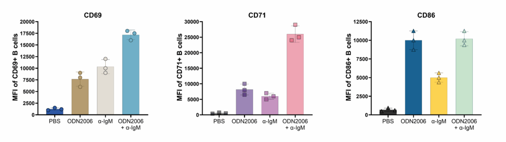 Figure-1: Cell marker expression levels on B cells. Stimulation with PBS, ODN2006 (1uM), α-IgM (50 ug/ml), and combination of ODN2006 + α-IgM. Cells treated with compounds for 24 hrs.