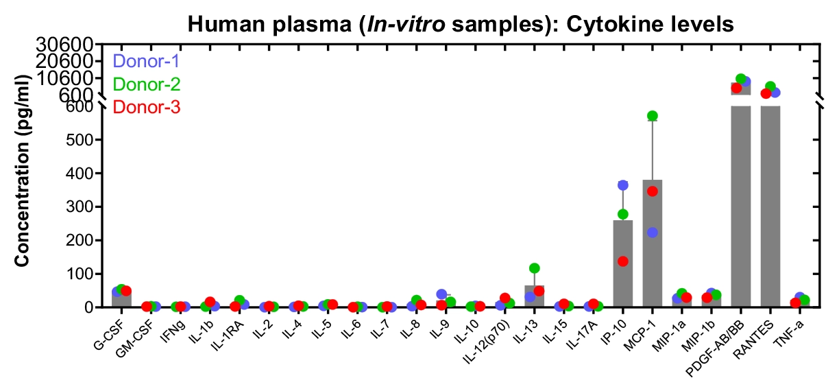Figure-C: Concentration of each Cytokine analyte in healthy donor plasma samples (in vitro), along with standard curves.