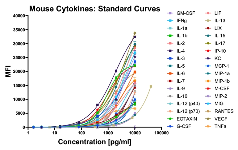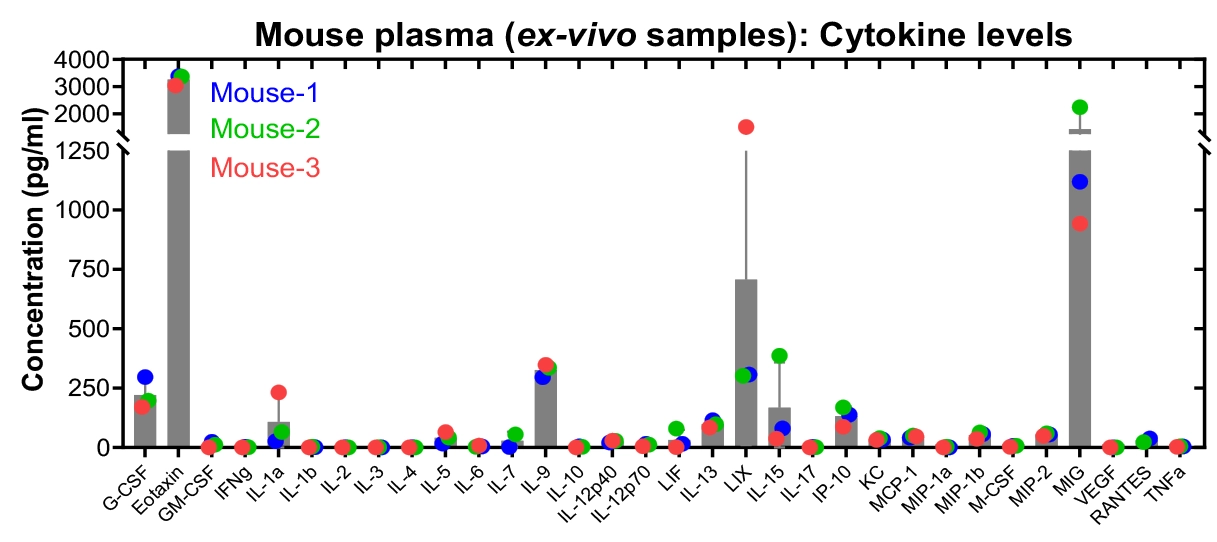 Figure-B: Concentration of each Cytokine analyte in Vehicle treated ex vivo mouse plasma, along with standard curves.