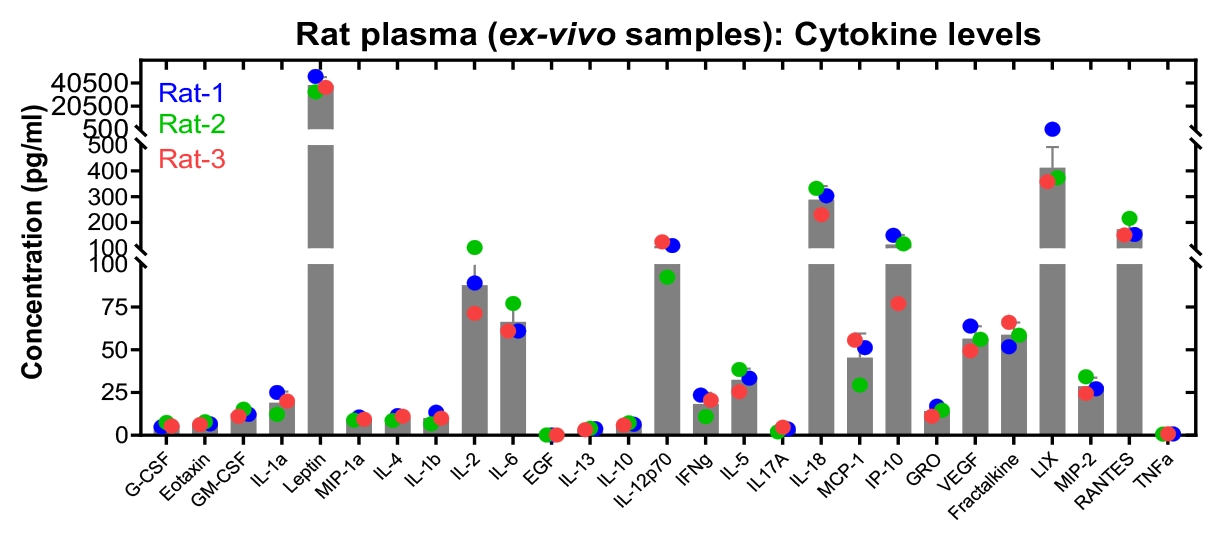 Ex-vivo sample analysis provides a means to confirm the in-vivo effect of test compounds and to identify the correlation between in vivo efficacy and biomarkers. In this study, ex-vivo rat and mouse plasma samples, and human plasma from healthy donors were analysed for cytokines as biomarkers.