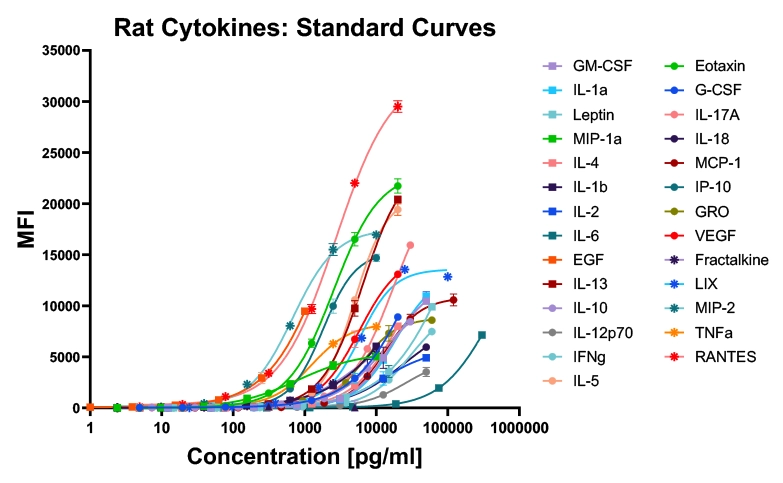 Figure-A: Concentration of each Cytokine analyte in Vehicle treated ex vivo rat plasma, along with standard curves.