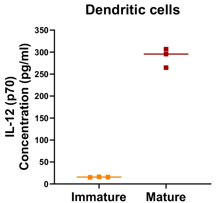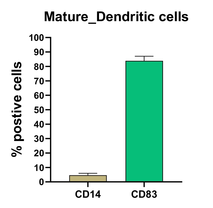 Isolated monocytes from fresh healthy donor whole blood were differentiated into dendritic cells, validated by cytokine profiling and surface marker expression. Suitable in vitro assay models for measuring a compound’s effect on dendritic cell function and gene expression.