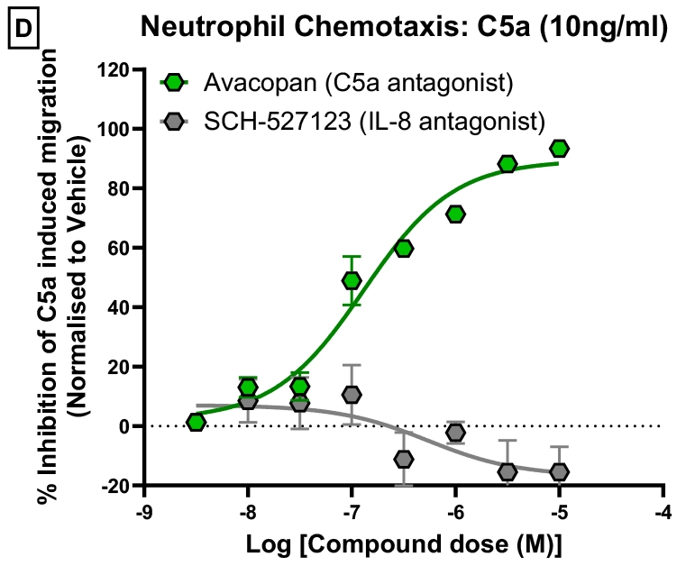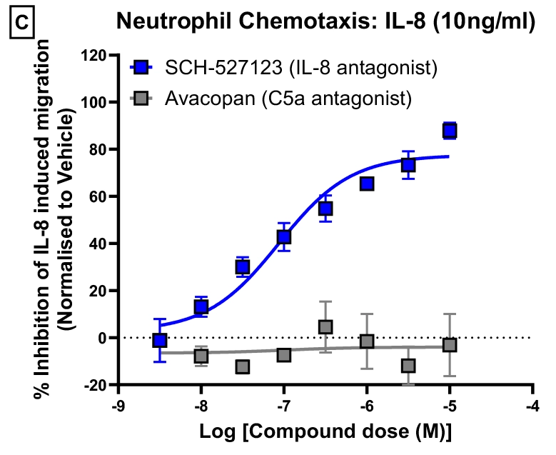 Here we demonstrate specificity of IL-8 and C5a induced Neutrophil migration using tool compounds. IL-8 strongly induces neutrophil migration that is inhibited by IL-8 antagonist (SCH527123) but not by C5a antagonist (Avacopan). C5a strongly induces neutrophil migration that is inhibited by C5a antagonist (Avacopan) but not by IL-8 antagonist (SCH527123).