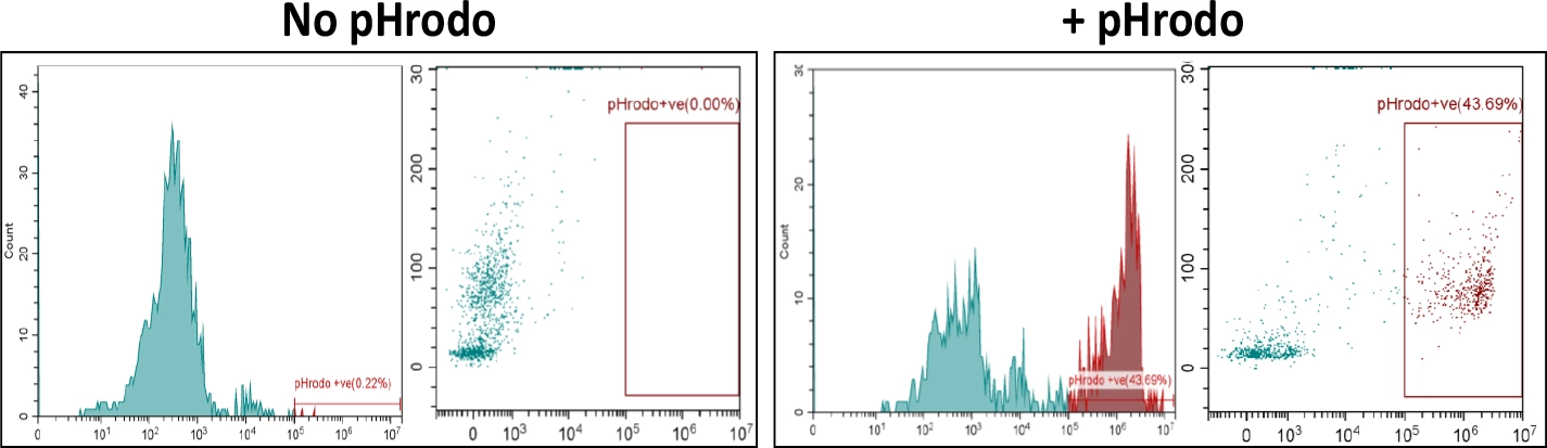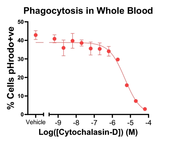 Figure-A: Healthy donor whole blood labelled with pHrodo bacterial particles. Effect of Cytochalasin-D Dose Response Curve on Phagocytosis was measured using Flow Cytometry. Cytochalasin-D showed complete inhibition of phagocytosis in whole blood.