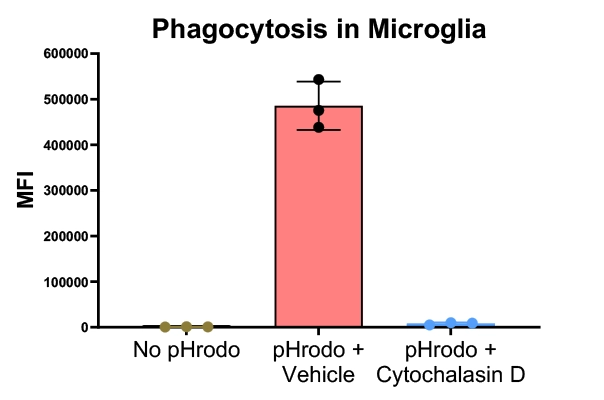 Figure-B: Matured iPSC microglia were labeled with pHrodo bacterial particles, and phagocytosis was measured in the presence and absence of  Cytochalasin-D (10 uM) using cell imaging. Cytochalasin-D showed complete inhibition of phagocytosis in Microglia