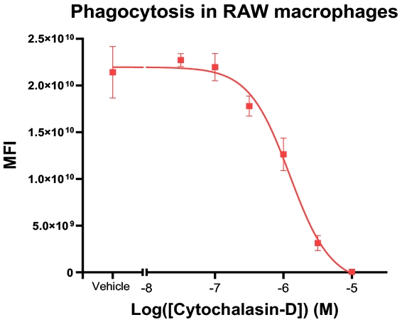 Figure-C: RAW macrophages were labeled with pHrodo. Effect of Cytochalasin-D Dose Response Curve on Phagocytosis was measured using cell imaging. Cytochalasin-D showed complete inhibition of phagocytosis in RAW cells